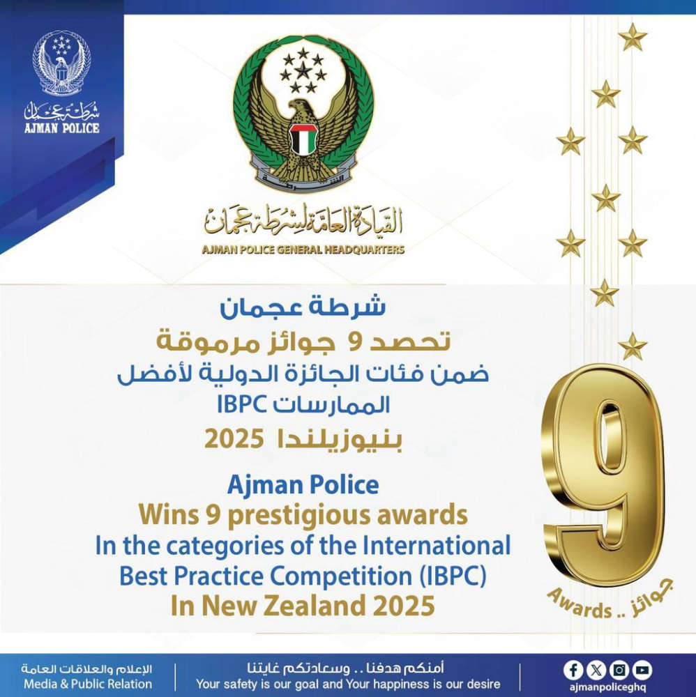 فازت القيادة العامة لشرطة عجمان، بـ9 جوائز دولية في الدورة الحادية عشرة للجائزة الدولية لأفضل الممارسات (IBPC) التي أُقيمت في نيوزيلندا لعام 2025، وسط مشاركة واسعة من المؤسسات العالمية المختلفة.
