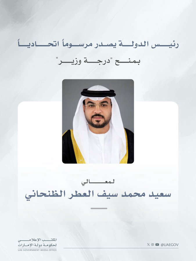 أصدر صاحب السمو الشيخ محمد بن زايد آل نهيان، رئيس الدولة "حفظه الله" مرسوماً اتحادياً بمنح معالي سعيد محمد سيف العطر الظنحاني درجة وزير