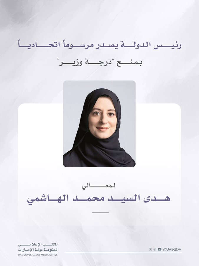 أصدر صاحب السمو الشيخ محمد بن زايد آل نهيان، رئيس الدولة، حفظه الله، مرسوماً اتحادياً بمنح هدى الهاشمي درجة وزير.